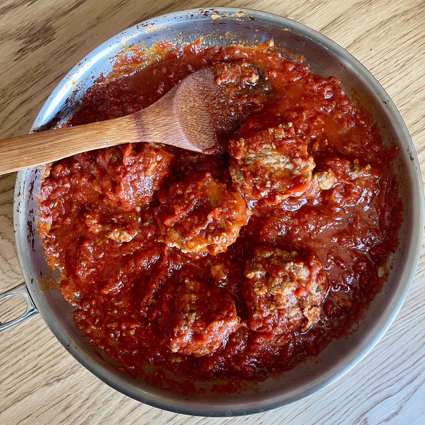 I, of course, make my own little tweaks because I’m me, and I also don’t usually have a half-loaf of white bread lying around. I often use panko bread crumbs in its place, and that works just fine. I like the flavor of golden raisins more than regular ones, too, so those will go in. And I’ve found myself fancying the simple Calabrian sauce from Anna Francese Gass for serving, made with Bianco DiNapoli tomatoes. After I bake the meatballs through, they get tossed with the sauce and set right on the table, either with bread or over the top of homemade spaghetti.